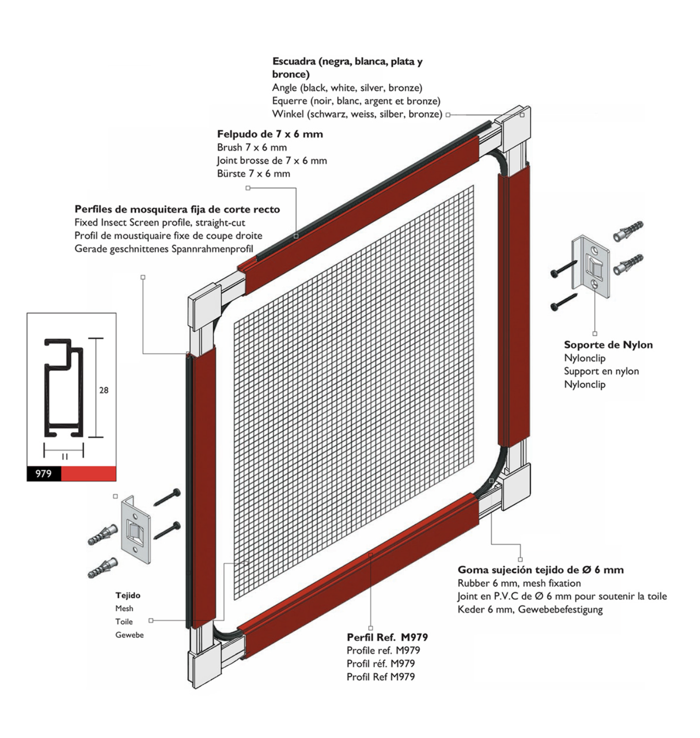 Las piezas que componen los accesorios de nuestras mosquiteras están fabricadas mediante inyección de Poliamida 6 <PA6>, esto permite conseguir una flexibilidad y una alta resistencia.